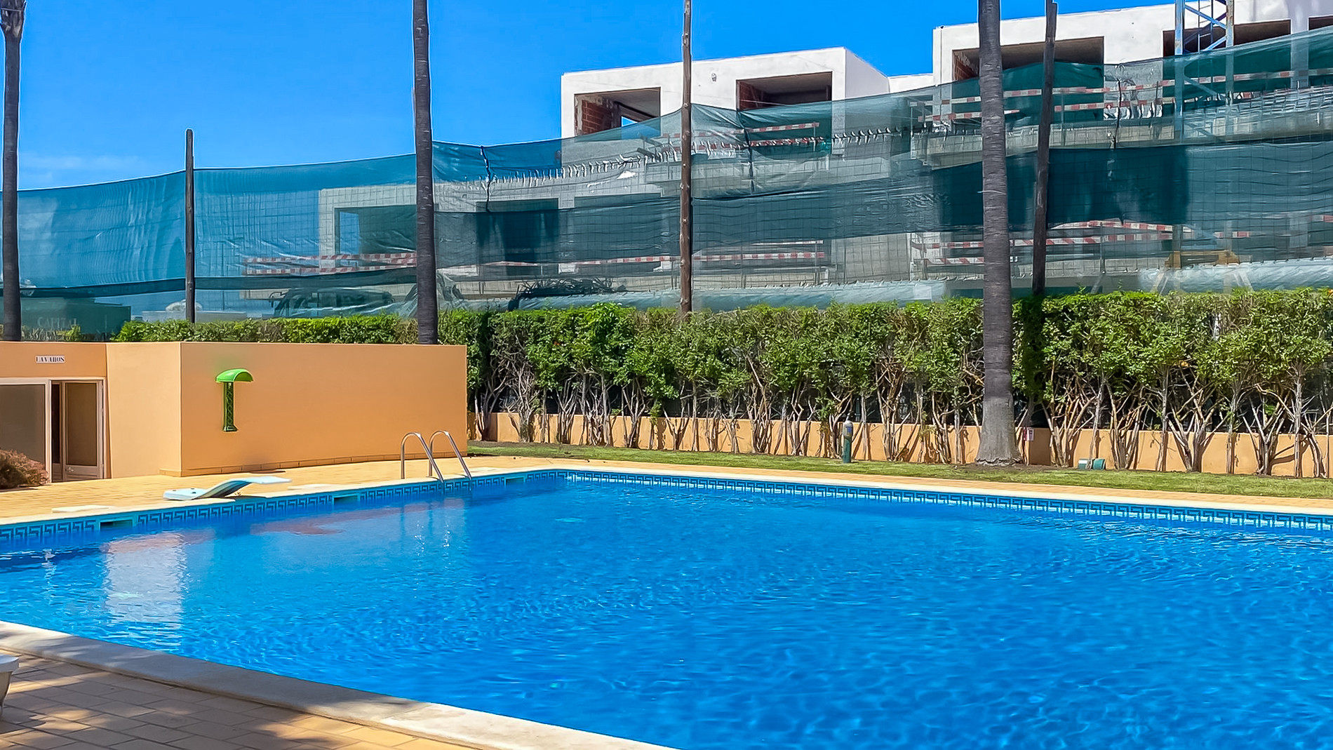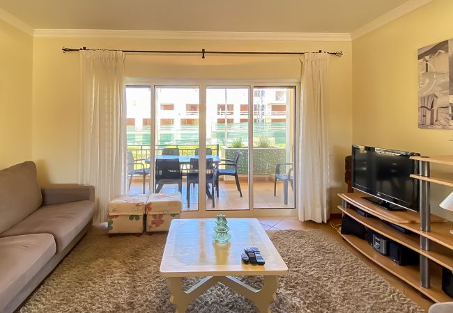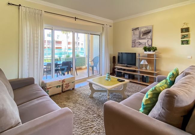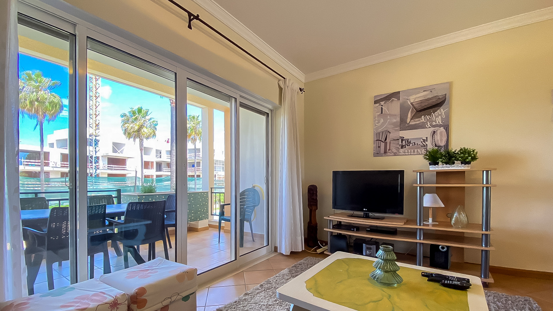 Ao entrar no apartamento, observará uma área de estar bem iluminada e arejada, com acesso a uma cozinha semi-open com amplo espaço para que todos possam relaxar. A sala está decorada com sofás confortáveis, uma televisão de ecrã plano e janelas do chão ao teto que proporcionam muita luz natural e exibem uma vista deslumbrante da piscina.