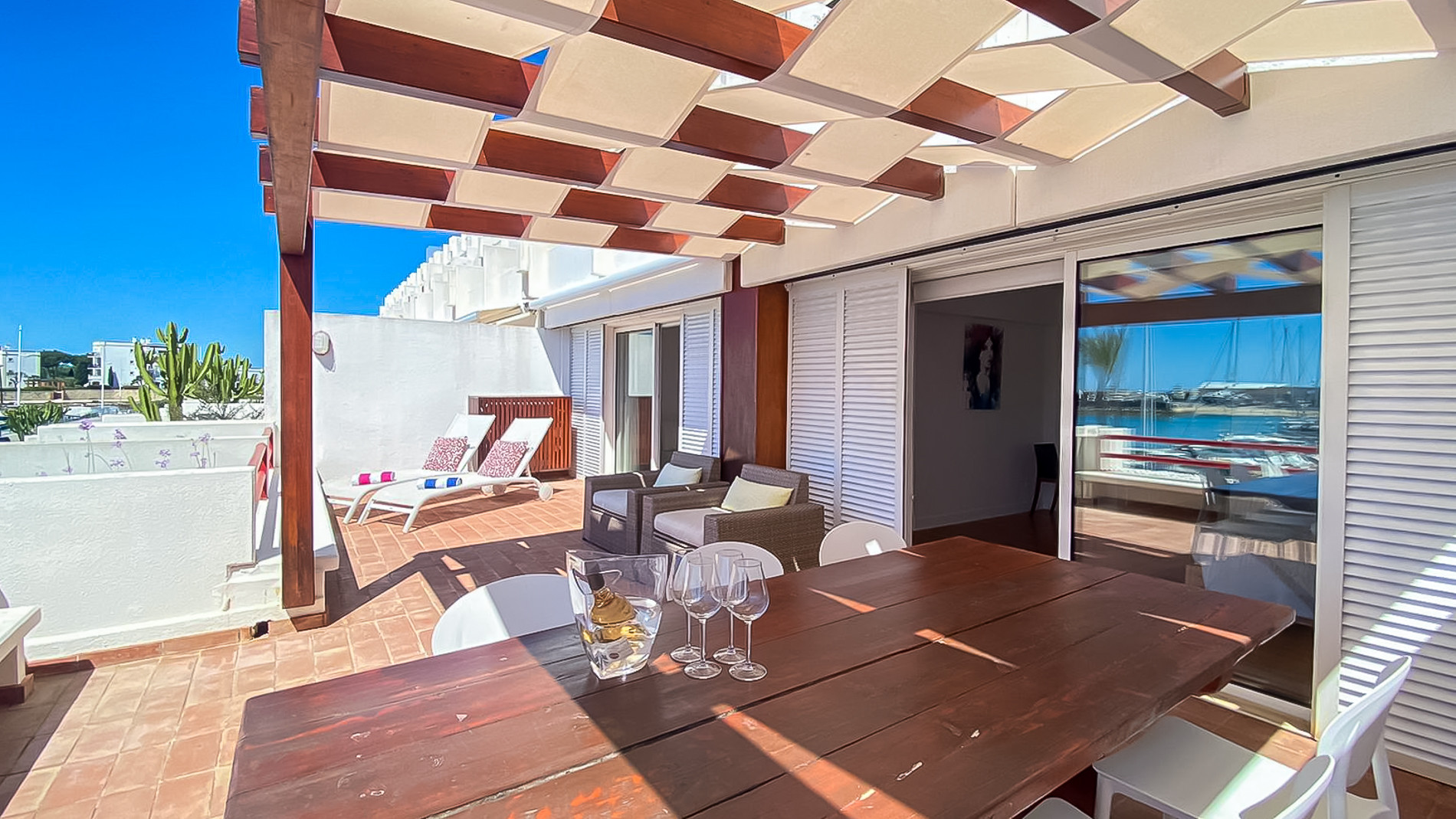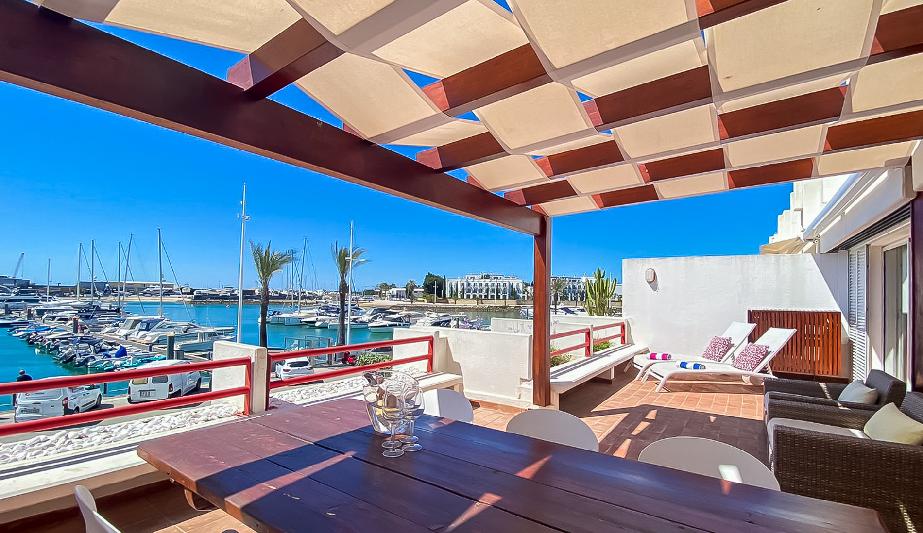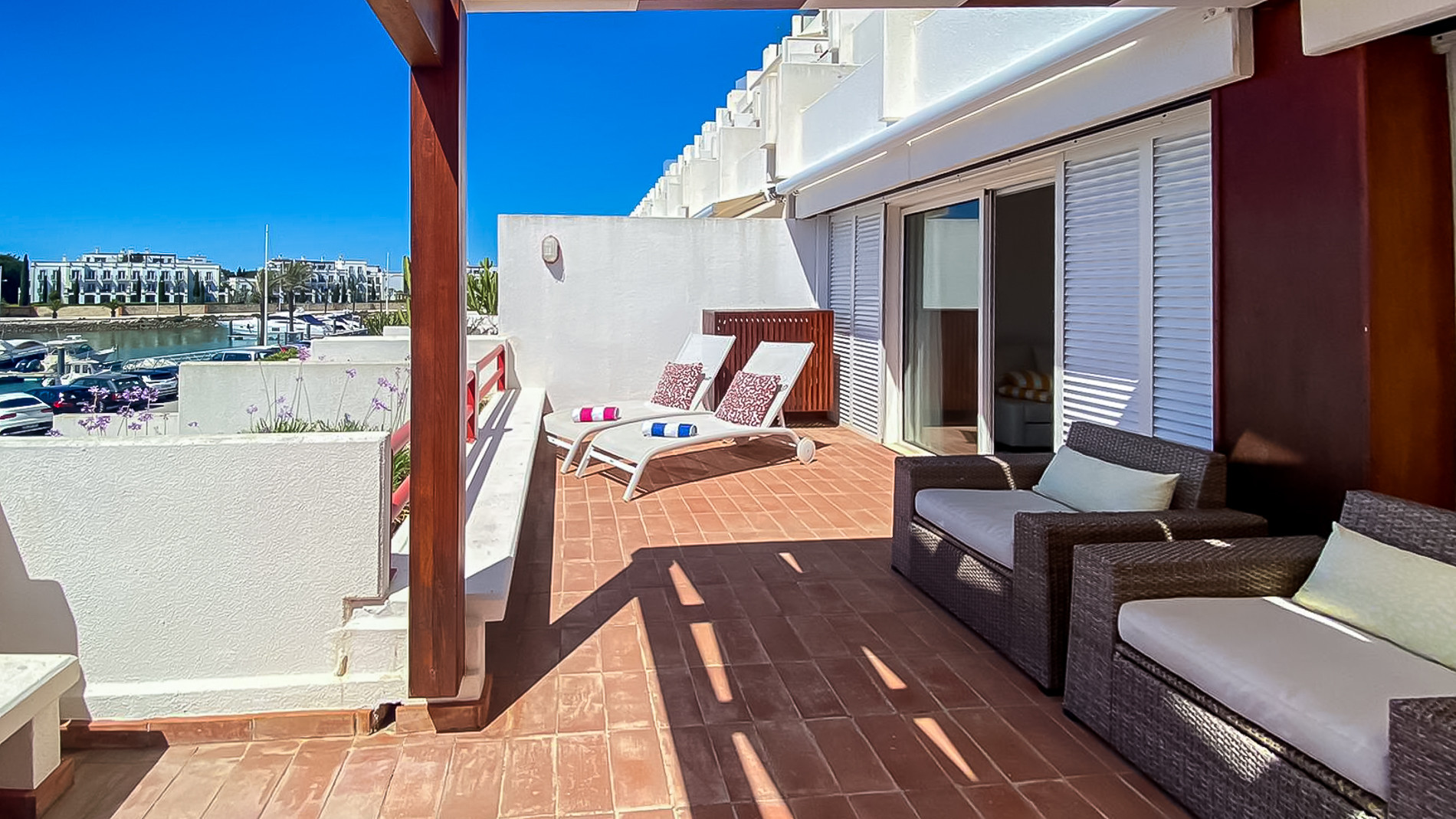 Na varanda aprecie a vista deslumbrante da piscina e arredores. Este espaço exterior é perfeito para tomar o seu café da manhã ou desfrutar de um cocktail ao fim do dia enquanto o sol se põe sobre a Marina de Vilamoura.