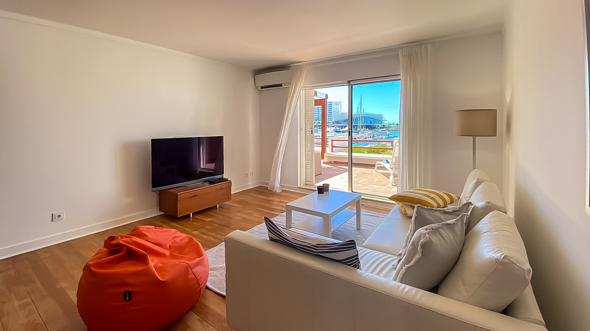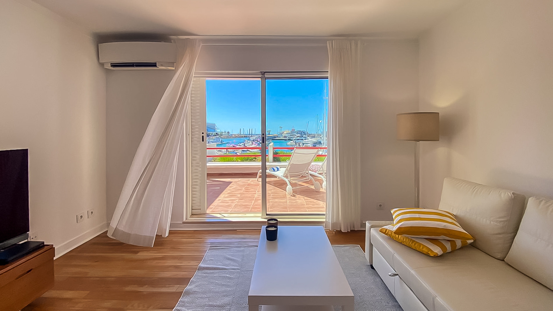 A sala de estar possui, grandes janelas que mostram uma deslumbrante vista para a marina. Quer esteja para descontrair após um dia de exploração ou para desfrutar de uma noite acolhedora, este espaço é perfeito para relaxar.