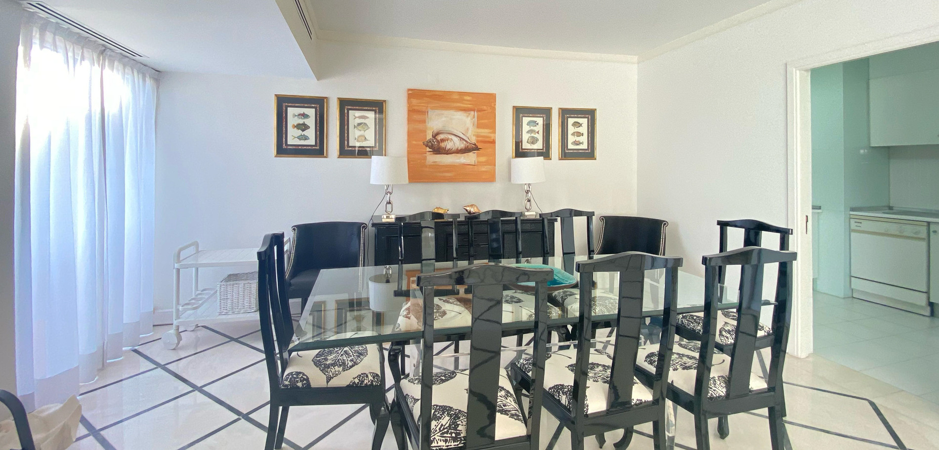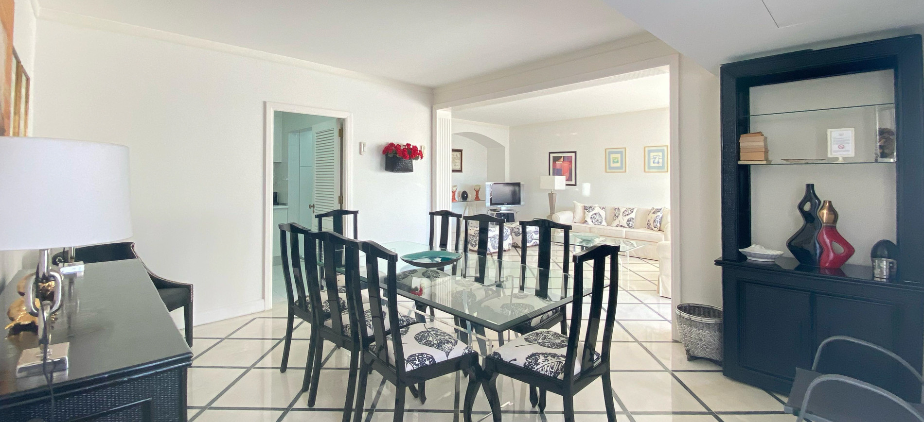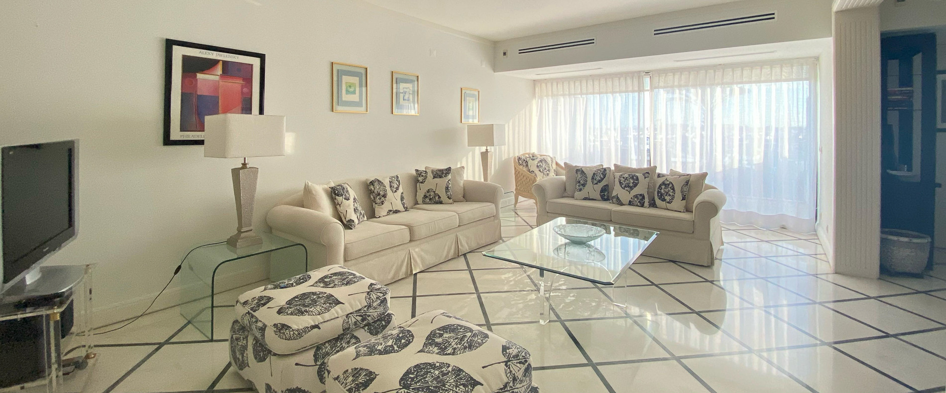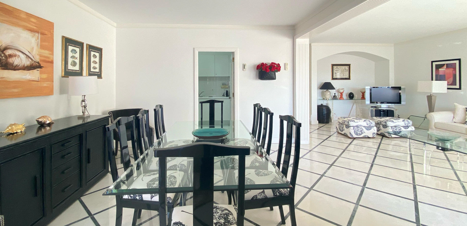 Upon entering the apartment, you will observe a well-lit and airy living area, with access to a semi-open kitchen with ample space for everyone to relax. The living room is decorated with comfortable sofas, a flat-screen TV, and floor-to-ceiling windows that provide plenty of natural light and display a stunning pool view.