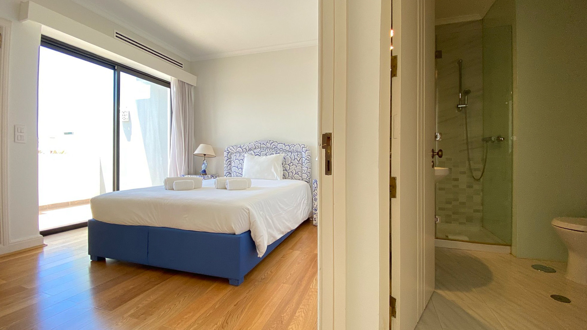 The apartment has two cosy bedrooms, each with its own full bathroom. Both rooms are equipped with air conditioning and a wardrobe to make your stay as comfortable as possible.
