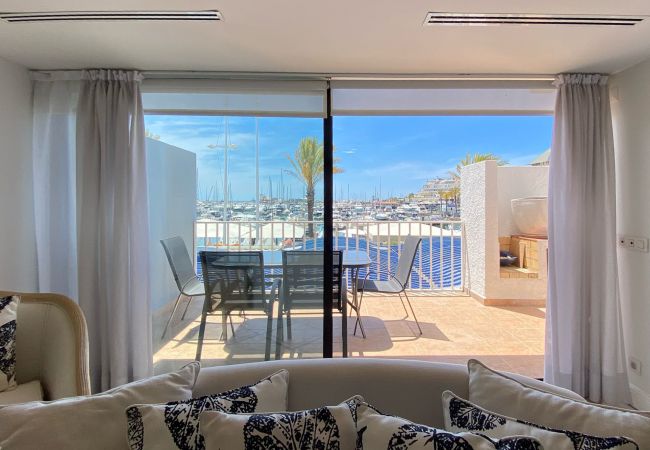 The living room features large windows showcasing a stunning marina view. Whether you're unwinding after a day of exploration or enjoying a cosy evening, this space is perfect for relaxation.